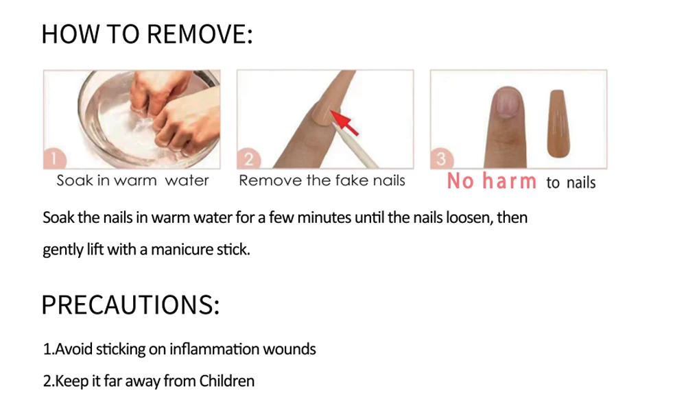 Package contains: 24 pcs nails in a box with plastic tray+ 24 Jelly Tabs+ 1 Mini file+ 1 stick