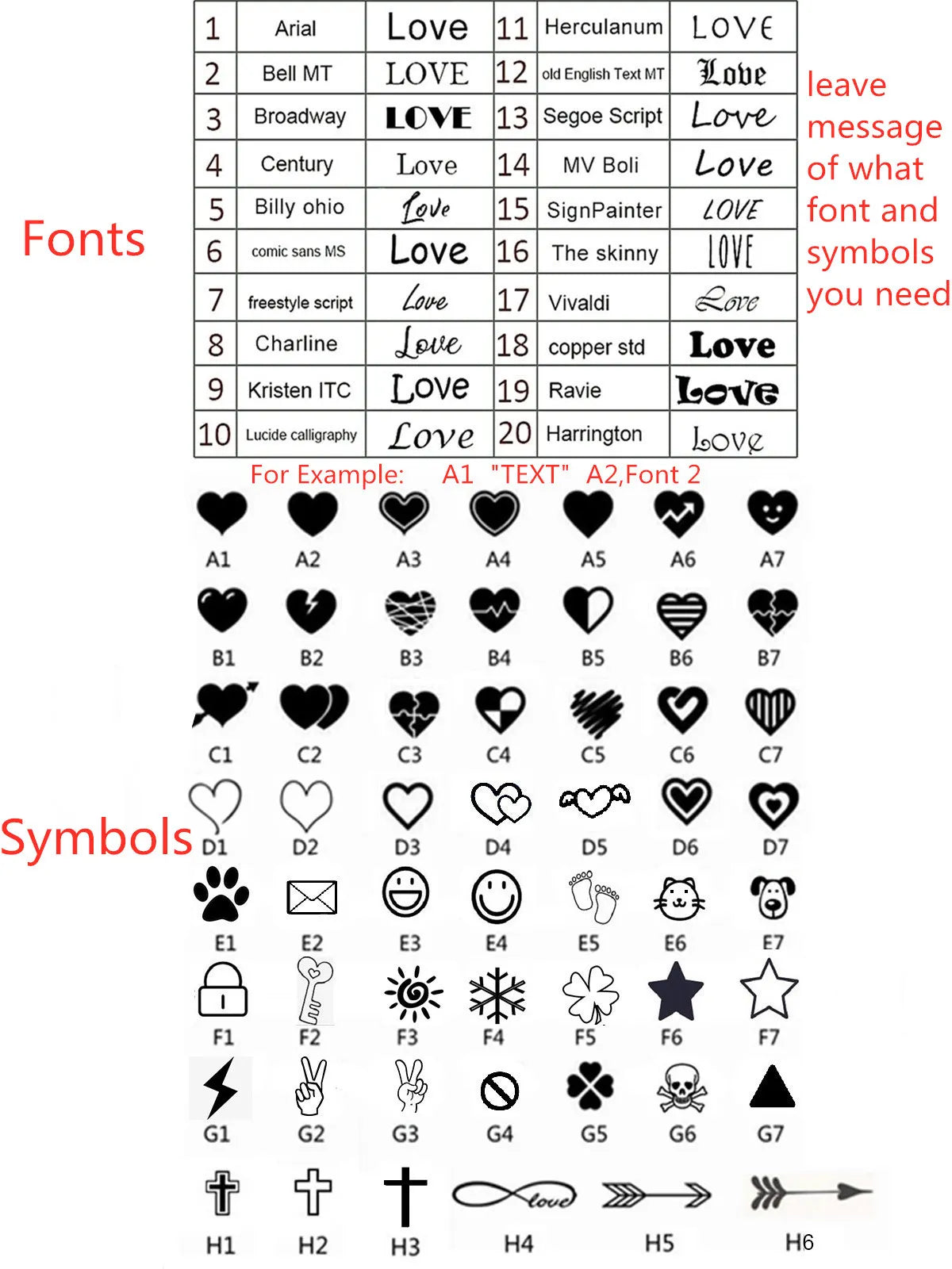 Choose the font or Symbols you want, and tell the customer service the corresponding Arabic numerals or leave a note.